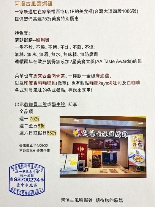 地址:臺中市沙鹿區忠貞路20巷176號 優惠內容: 1.場地使用收費標準比照員工親友優惠價格。 2.桌餐餐飲不…